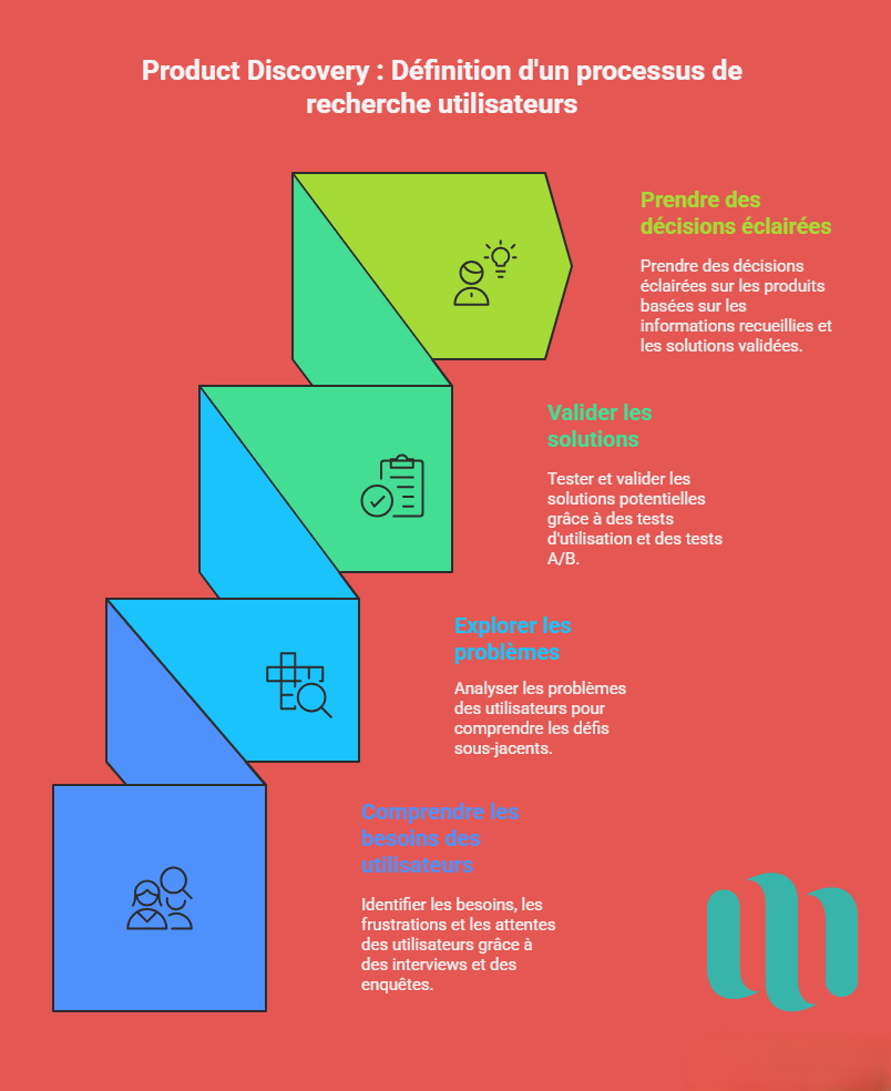 Comme expliqué plus haut, le Product Discovery (ou Discovery Product) est un processus qui permet aux équipes produit de décider quoi construire avant même de passer en phase de développement. Le concept de discovery product management vise à comprendre en profondeur les besoins, frustrations et attentes des utilisateurs pour orienter ces choix.